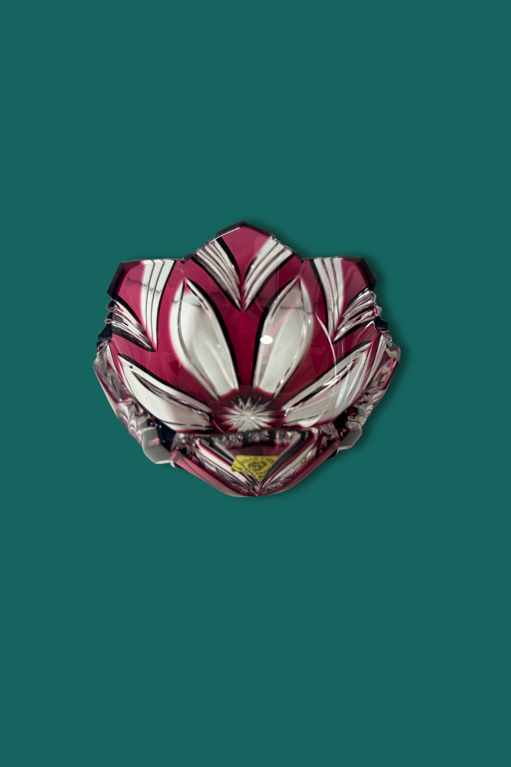 Vintage Handcut Bohemia Cesar Crystal Bowl with Original Sticker, Lotus Red